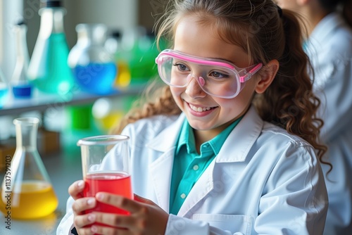 Young Girl Scientist Experimenting with Colorful Liquids in Lab, Perfect for Educational and Inspirational Posters