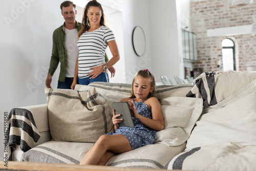 Young girl using tablet on sofa while parents smiling in background at home