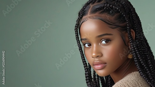 Young girl with braided hair posing against a soft green backdrop with a serene expression in natural light interior setting