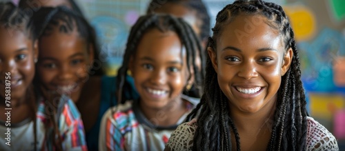 Young girl with braided hair wearing a smile stands cheerfully in front of a diverse group of joyful children