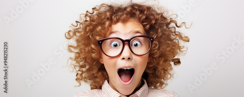 Young girl with curly hair and glasses expressing excitement in a cheerful indoor setting