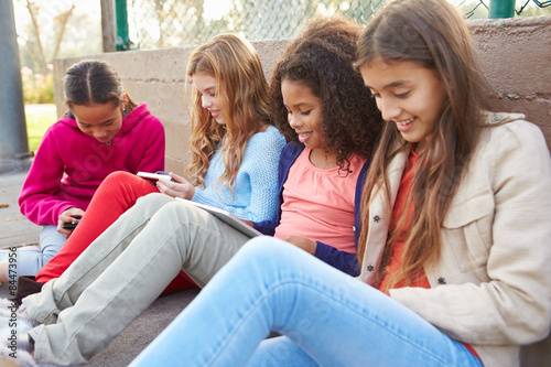 Young Girls Using Digital Tablets And Mobile Phones In Park