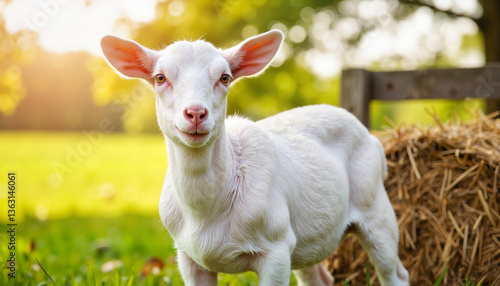 Young goat standing playfully on a sunny farm background
