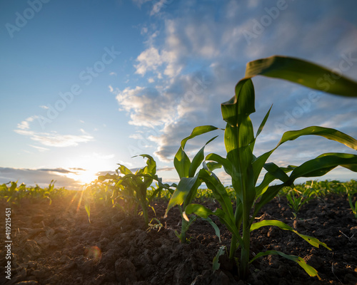 Young green corn on stalk in fields