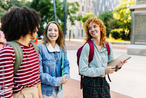 Young group of diverse female students walking at college campus, holding notebooks and folders, enjoying their time at university. Education lifestyle concept.