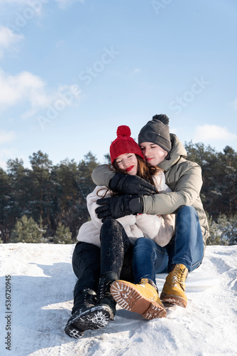 Young guy and a girl sit and hug on the snow against the background of the forest and the blue sky. Vertical frame