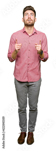 Young handsome business casual man amazed and surprised looking up and pointing with fingers and raised arms.