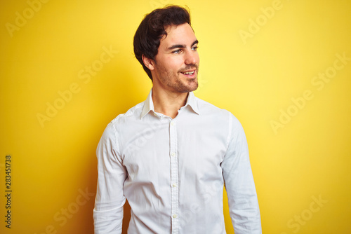 Young handsome businessman wearing elegant shirt standing over isolated yellow background looking away to side with smile on face, natural expression. Laughing confident.