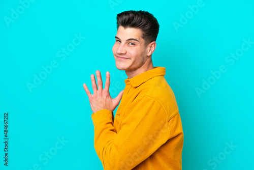 Young handsome caucasian man isolated on blue bakcground scheming something