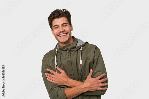 Young handsome caucasian man isolated on white background laughing and having fun.