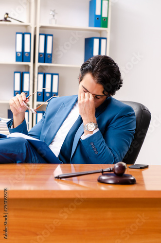 Young handsome judge sitting in courtroom