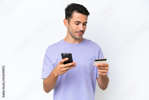 Young handsome man over isolated white background buying with the mobile with a credit card