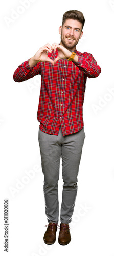 Young handsome man smiling in love showing heart symbol and shape with hands. Romantic concept.