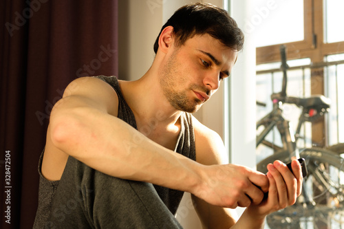 Young handsome man using phone while having exercise break in gym. Guy using smartphone after the daily training.