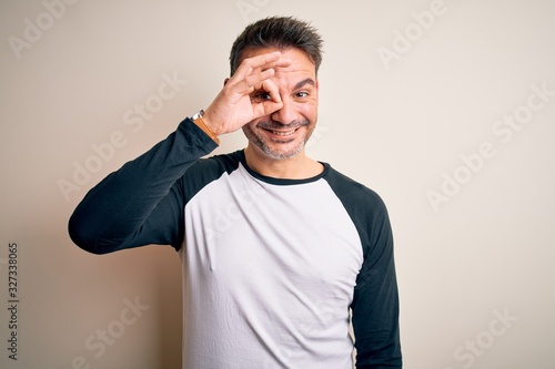 Young handsome man wearing casual t-shirt standing over isolated white background doing ok gesture with hand smiling, eye looking through fingers with happy face.
