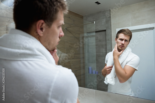 young handsome man with white towel on his shoulders looking in the bathroom mirror touching his face with one hand