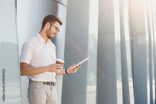 Young happy businessman drinking coffee and using tablet outside