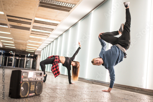 Young happy couple dancing on the street with a vintage radio cassette stereo .