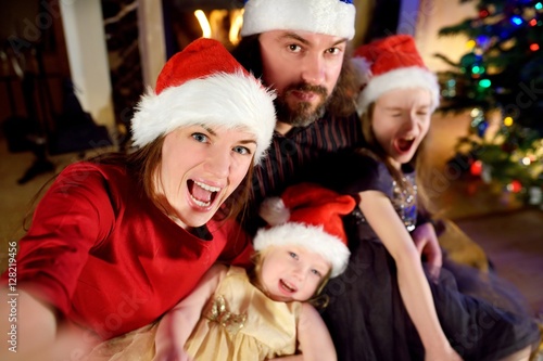 Young happy family of four taking a photo of themselves on Christmas