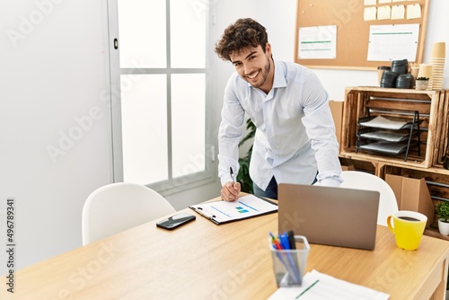 Young hispanic businessman smiling happy working at the office.