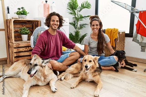 Young hispanic couple doing laundry with dogs with a happy and cool smile on face. lucky person.
