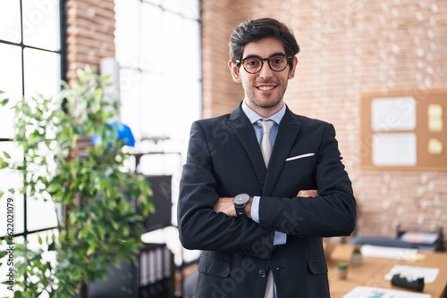 Young hispanic man business worker standing with arms crossed gesture at office