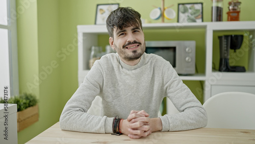 Young hispanic man smiling confident sitting on the sable at dinning room