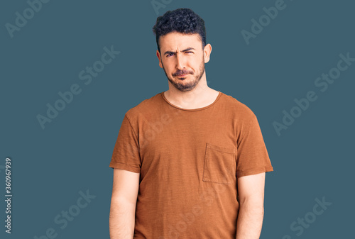 Young hispanic man wearing casual clothes skeptic and nervous, frowning upset because of problem. negative person.