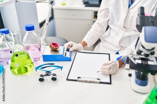 Young hispanic woman scientist weighing gemstone writing report at laboratory