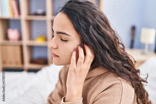 Young hispanic woman sitting on bed suffering for ear pain at bedroom