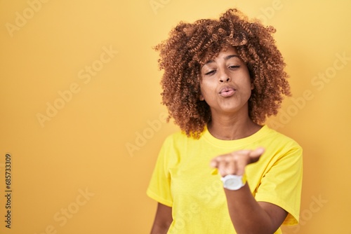 Young hispanic woman with curly hair standing over yellow background looking at the camera blowing a kiss with hand on air being lovely and sexy. love expression.