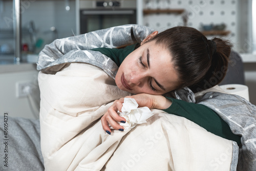 Young ill woman wrapped in blanker blowing her nose in to the toilet paper. Sick female sitting at home on sofa try to warm up suffering from common cold or flu, feeling exhausted and tired.
