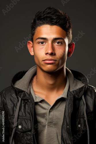 Young immigrants hopeful yet uncertain gaze isolated on a grey gradient background