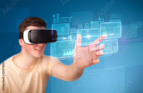 Young impressed man wearing virtual reality goggles with blue squares containing data at his fingers