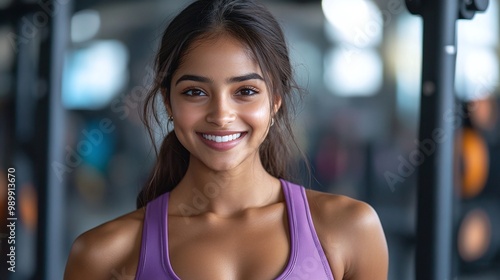 young Indian woman in the gym, wearing trendy purple workout clothes and smiling with vibrant energy, showcasing confidence and a strong fitness lifestyle