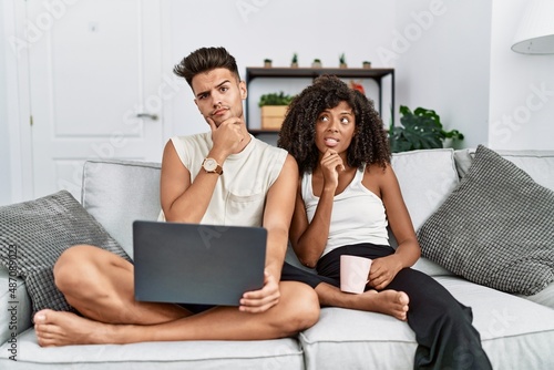 Young interracial couple using laptop at home sitting on the sofa thinking worried about a question, concerned and nervous with hand on chin