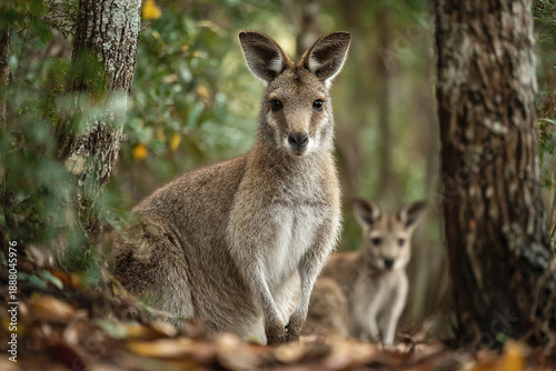 Young kangaroo in natural forest environment with another kangaroo blurred in background, showing alert and calm wildlife behavior in autumn setting