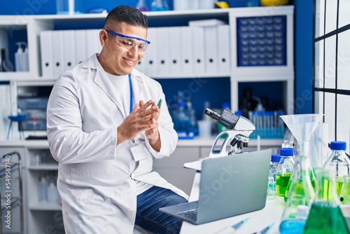 Young latin man scientist smiling confident having video call at laboratory