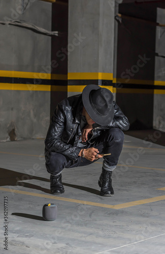 Young latin man with leather jacket, crouching looking his smartphone in underground car parking
