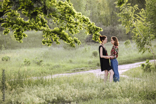 Young lesbian couple hugging at sunset outdoors