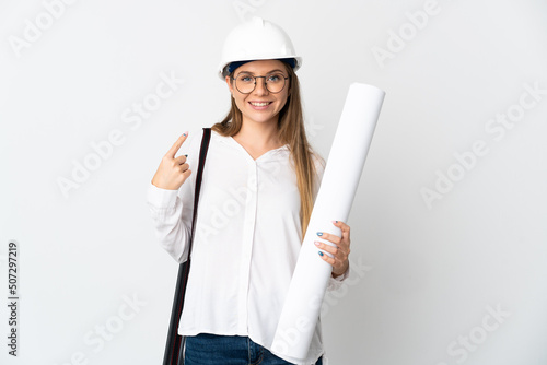 Young Lithuanian architect woman with helmet and holding blueprints isolated on white background giving a thumbs up gesture