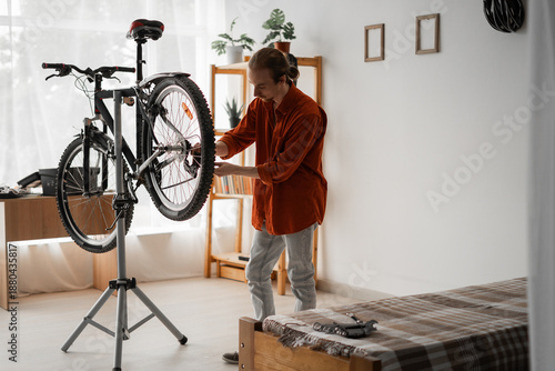 Young long-haired man wearing orange shirt repairing bicycle, rear wheel adjustment at home.