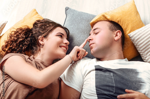 Young lovely couple newlyweds lying on the floor with pillows and look at each other, making faces grimaces, romantic atmosphere. Husband and wife relaxing, chilling indoor.
