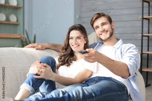 Young loving couple on sofa at home watching tv and laughing.