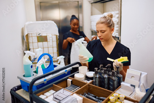 Young maid restocking cart before cleaning hotel guest room.