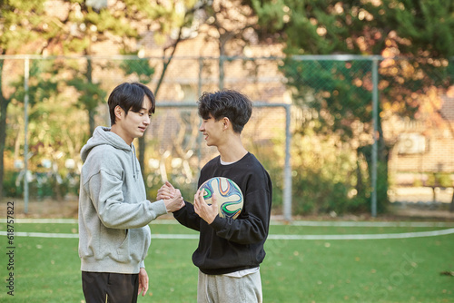Young male college students pose for a post-match shoulder rub at a university futsal field in South Korea, Asia
