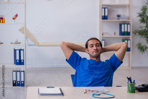 Young male doctor being extremely tired in the clinic