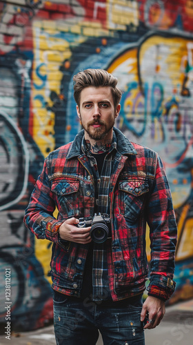 Young Male Photographer with Vintage Camera in Urban Graffiti Setting
