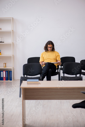 Young male student waiting for teacher in the classroom