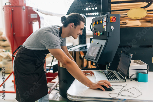 Young Male worker operating coffee roasting machine at factory